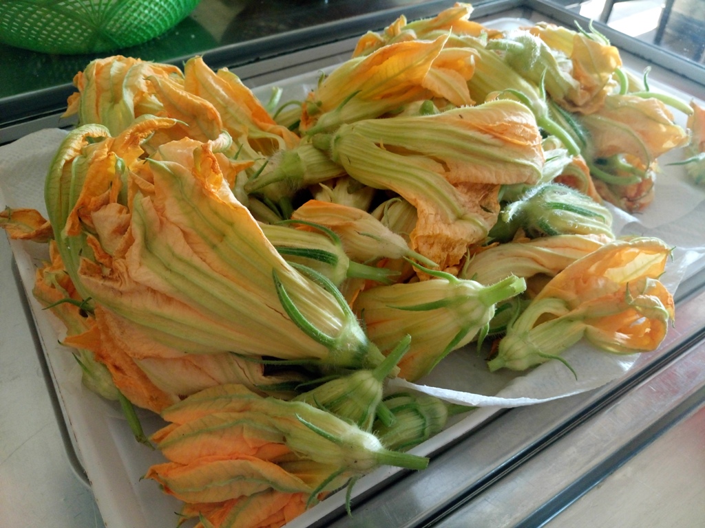 Μια βόλτα στην κουζίνα με πείθει για την φρεσκάδα και την εντοπιότητα των υλικών, που καθημερινά καταφθάνουν εδώ. Ολοζώντανα κολοκυθολούλουδα…
