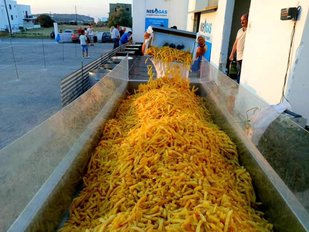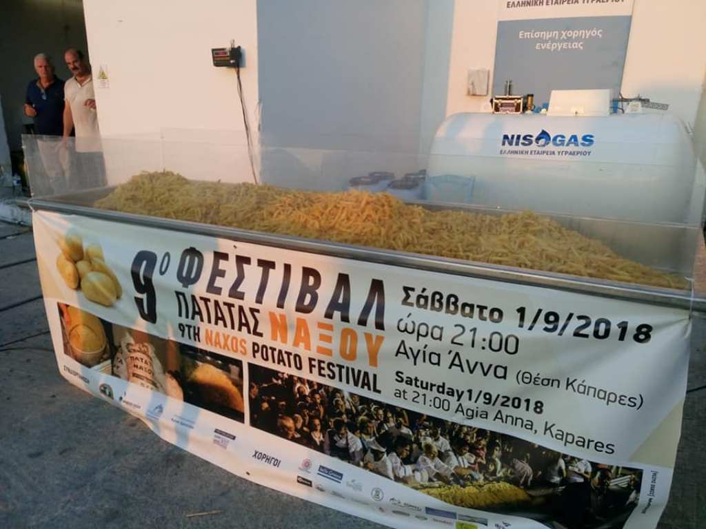 Κατά τη διάρκεια του 9ου Φεστιβάλ Πατάτας Νάξου 2018, πέρυσι τον Σεπτέμβριο, η περίφημη Πατάτα Νάξου, έσπασε το ρεκόρ Guinness για δεύτερη συνεχόμενη χρονιά, κατακτώντας με το σπαθί της μία ακόμα ζηλευτή θέση στην Βίβλο των παγκόσμιων ρεκόρ. Ποια είναι όμως η συνταγή και ποια τα υλικά για το σπουδαίο αυτό κατόρθωμα; Ακούστε προσεκτικά, είναι πολύ απλό! Παίρνεις περίπου 2.500 κιλά ακαθάριστες πατάτες Νάξου, από την Ένωση Αγροτικών Συνεταιρισμών (Ε.Α.Σ.) Νάξου, η οποία όχι μόνο διαχειρίζεται την παραγωγή 200 και πλέον αγροτών που καλλιεργούν πατάτα, αλλά είχε και την ιδέα της συγκεκριμένης δράσης, που προβάλλει το μοναδικό αυτό προϊόν σε παγκόσμιο επίπεδο! Στη συνέχεια αναθέτεις σε δεκάδες γυναικών-εθελοντριών σε ολόκληρο το νησί, το επίπονο έργο -που με χαρά αναλαμβάνουν- του καθαρίσματος της εύγεστης ρίζας, που διαρκεί μία περίπου εβδομάδα, ρίχνεις 800 λίτρα ελαιόλαδο εξαιρετικής ποιότητος -της Ε.Α.Σ. πάντα, μην ξεχνιόμαστε- μέσα σε 22 καζάνια, που έχουν καταφθάσει απ’ όλα τα χωριά του νησιού και αρχίζεις το τηγάνισμα, έχοντας βεβαίως προηγουμένως εξασφαλίσει την χορηγία χιλιάδων λίτρων προπανίου, από την εταιρεία φυσικού αερίου Nisogas! Εννοείται ότι παράλληλα έχεις φροντίσει για την άρτια διαμόρφωση και τον εξοπλισμό των χώρων στις εγκαταστάσεις της Ε.Α.Σ., στον Άγιο Προκόπη, έχεις αναθέσει την επίβλεψη του τηγανίσματος στον Νάξιο chef Βαγγέλη Βενιέρη και έχεις προβλέψει τι θα κεράσεις (πατατολουκουμάδες, τυρολουκουμάδες, παγωτά, μπύρες, κρασί και φυσικά τηγανητές πατάτες) τους περίπου 3.000 προσκεκλημένους, που συρρέουν από κάθε γωνιά του νησιού -αλλά και από τα γειτονικά-, για να θαυμάσουν το πρωτοφανές θέαμα και τέλος «κλείνεις» τους γνωστούς τηλεπαρουσιαστές Χρήστο Νέζο και Μπάγια Αντωνοπούλου, για να παρουσιάσουν το φαντασμαγορικό show!