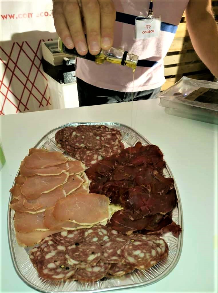 Ένας δίσκος με κερκυραϊκά αλλαντικά περιχύνεται με αγνό ελαιόλαδο, που ενισχύει την νοστιμιά των μοναδικών αυτών προϊόντων. Πρόκειται για κερκυραϊκό νούμπουλο Φουμικάδο (αριστερά), ένα άριστης ποιότητας προϊόν, που φτιάχνεται σύμφωνα με την μυστική συνταγή της οικογένειας Λαβράνου. Χοιρινό κρέας, μαριναρισμένο με μπαχαρικά και βότανα της κερκυραϊκής γης, περασμένο σε έντερο και καπνισμένο με αρωματικά κλαριά του νησιού, όπως φασκόμηλο, φλισκούνι ξερό, σχίνο, δάφνη κ.άλ. Στην δεξιά πλευρά του δίσκου ένα ακόμα ιδιαίτερο προϊόν, το Μοσχαρίσιο Νούμπουλο, που μοιάζει πολύ με το παραδοσιακό νούμπουλο Φουμικάδο και είναι ιδανικό για σαλάτες, μακαρονάδες, αλλά και ποικιλίες αλλαντικών για τους λάτρεις του μοσχαρίσιου κρέατος. Τέλος, το παραδοσιακό σαλάμι, το κερκυραϊκό σαλάδο, φτιάχνεται με εξαιρετικής ποιότητας χοιρινό και βόειο κρέας, με μπόλικο πιπέρι και αλάτι. Κρεμιέται και καπνίζεται με αρωματικά κλαριά από την γη της Κέρκυρας.