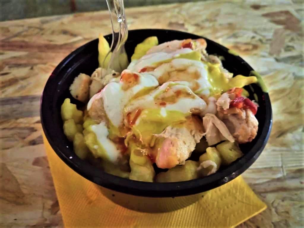 …για να μας απογειώσει κυριολεκτικά λίγο αργότερα με τον εκπληκτικό συνδυασμό: πατάτες τηγανητές, κοτόπουλο -βρασμένο και στη συνέχεια ψημένο- με τσίλι και πιπεριές, γιαούρτι με δυόσμο (από την γλάστρα τους, όπως μας τόνισε ο μερακλής κ. Βασίλης), τζίντζερ και curry!!!