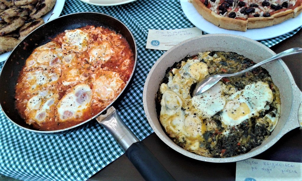 …ενώ ακριβώς μπροστά τους στέκονται δύο πεντανόστιμες παρασκευές με αυγά, μέσα στα τηγάνια τους; τα αυγά σε φρέσκια σάλτσα ντομάτας και τα χόρτα τσιγαριστά με αυγά μάτια, ένα από τα πλέον χαρακτηριστικά πιάτα του Πρωινού της Μαγνησίας.