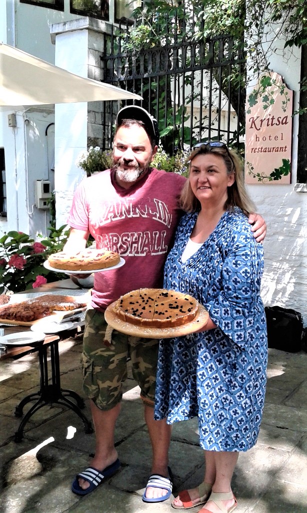 Βασίλης Καλλίδης και Ελένη Καραΐσκου κρατώντας ανά χείρας, αντίστοιχα, την πάστα φλώρα και την ξεσκούφωτη γαλατόπιτα.