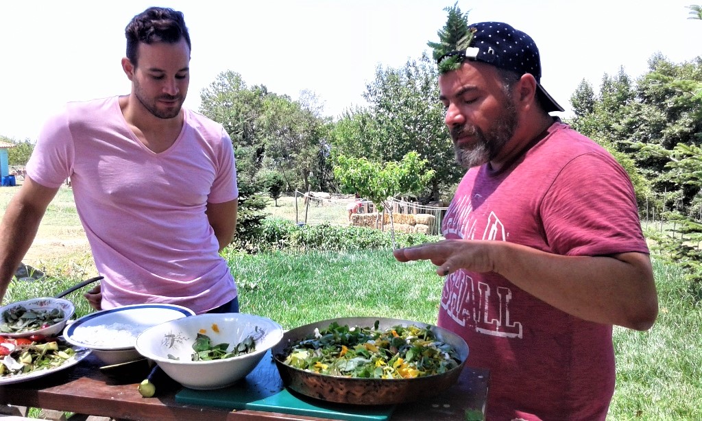 Ο Βασίλης επί το έργον. Τη φτέρη δεν την χρησιμοποίησε μόνο για να στολίσει το πιάτο, αλλά και το καπέλο του! Ο Αναξαγόρας Κριτσέλης συμπράττει μαζί του.
