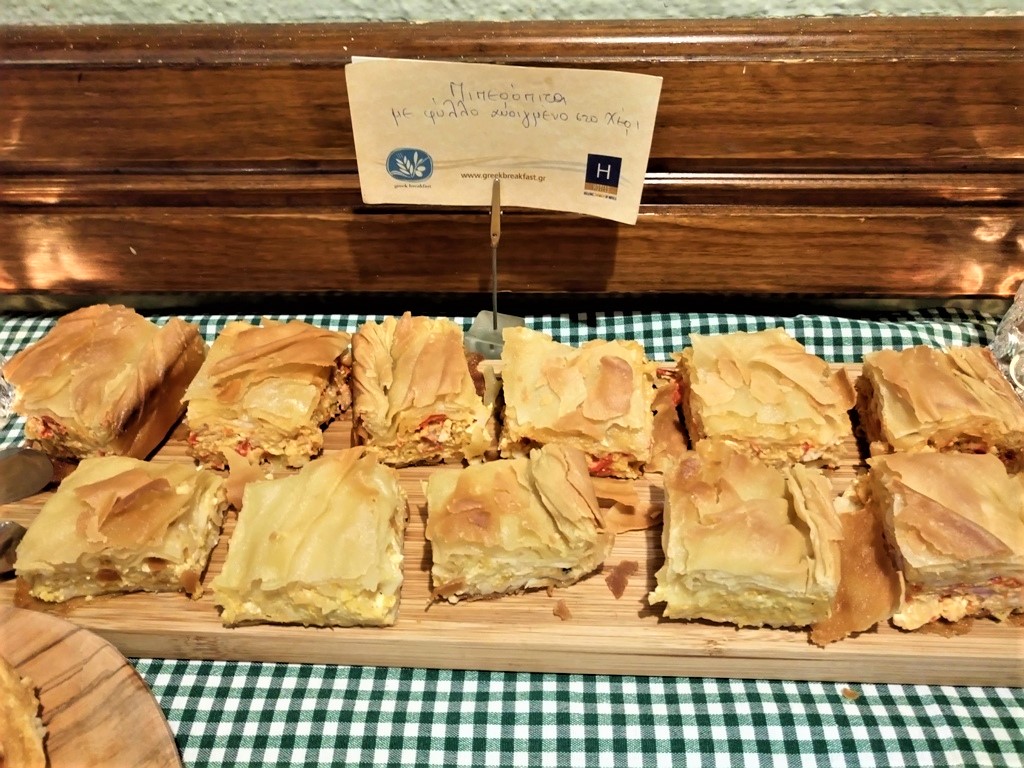 Εδώ, σε πρώτο πλάνο, η χορτοτυρόπιτα και η πιπερόπιτα, αμφότερες με φύλλο ανοιγμένο στο χέρι…