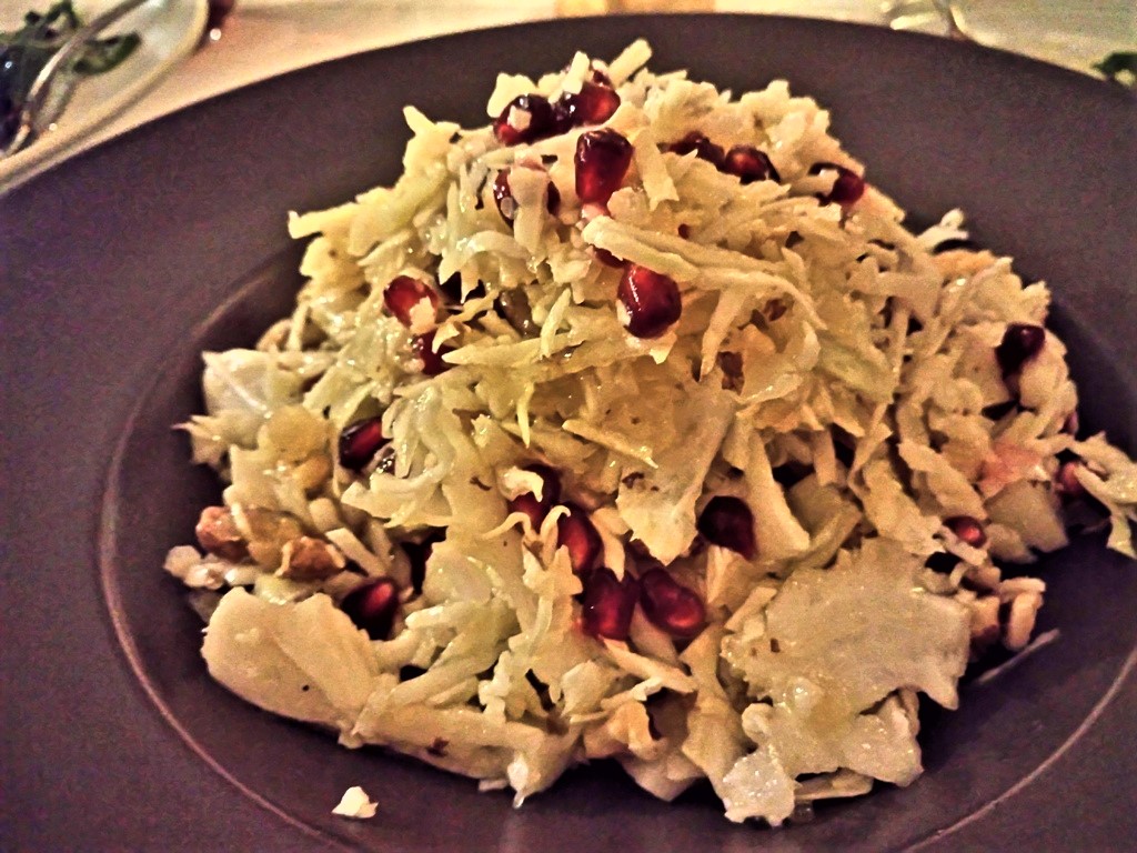 Σαλάτα Κρίτσα με ψιλοκομμένο λάχανο, ξινόμηλα Πηλίου, σπόρους ροδιού, καρύδια και γιαούρτι.