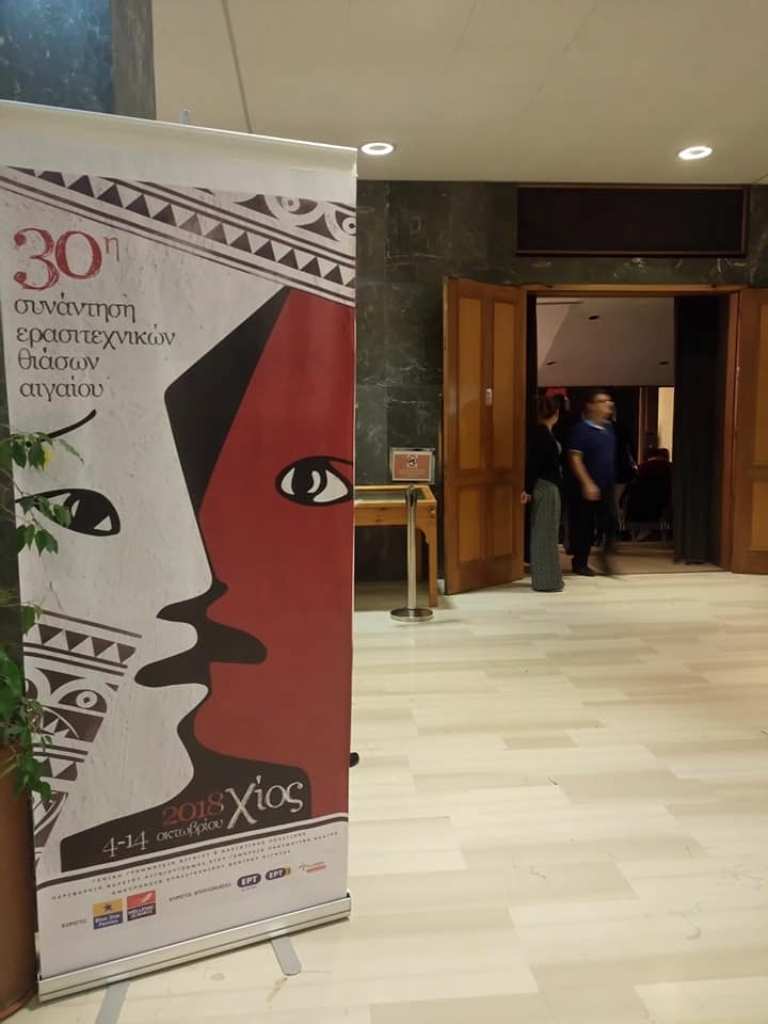 Η αφίσα της 30ής Συνάντησης Ερασιτεχνικών Θιάσων Αιγαίου στο φουαγιέ του Ομηρείου Πνευματικού Κέντρου Χίου.