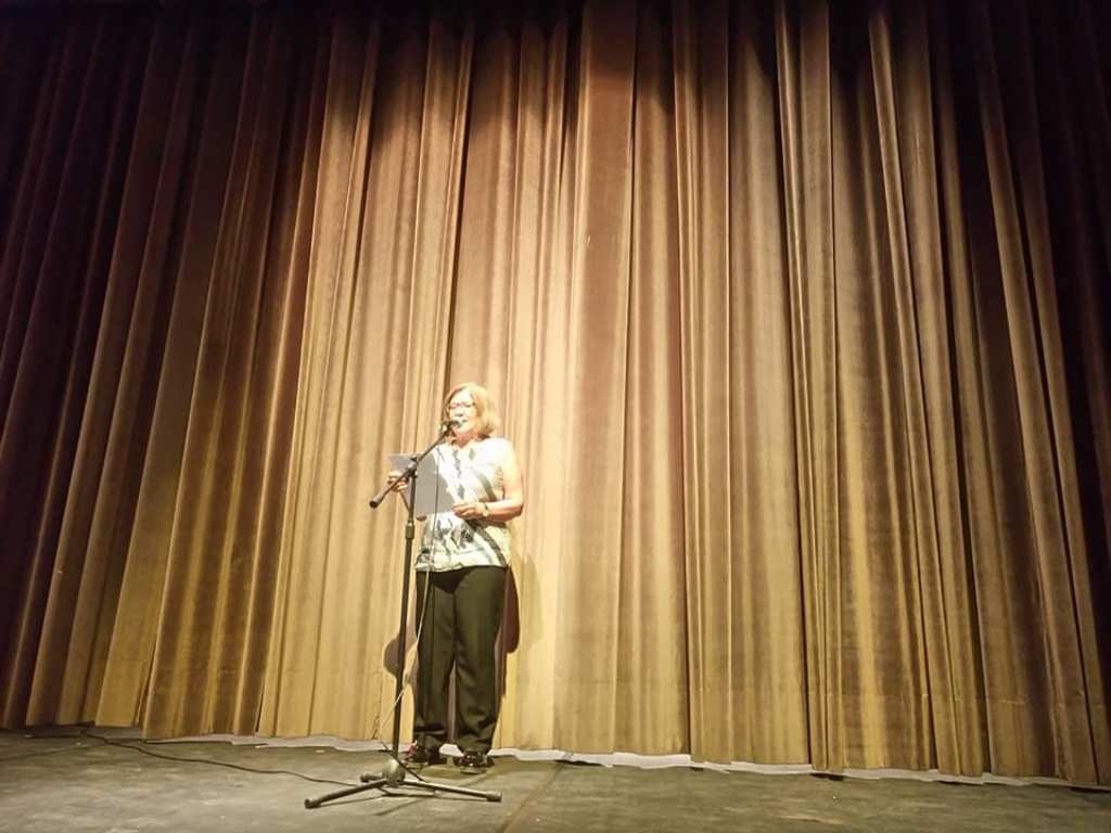 Η Μαρία Βενέτη, Πρόεδρος της Ομοσπονδίας Ερασιτεχνικών Θιάσων Αιγαίου, κατά την τελετή λήξης της Συνάντησης, στο Ομήρειο Πνευματικό Κέντρο Χίου. Η τελετή έναρξης είχε πραγματοποιηθεί στον ίδιο χώρο την Παρασκευή 5 Οκτωβρίου.