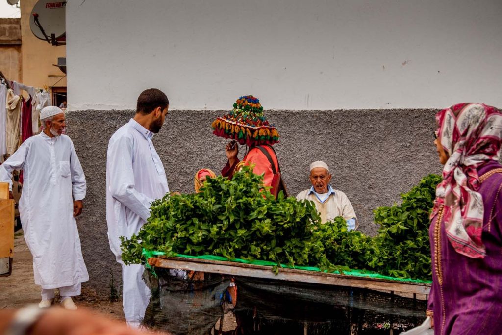 Ένας νερουλάς στέκεται δίπλα σε ένα καρότσι γεμάτο μέντα, απαραίτητη για την ετοιμασία του Μαροκινού τσαγιού.