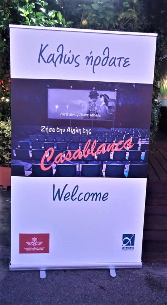 Το αεροδρόμιο της Αθήνας και η Royal Air Maroc (R.A.M.), εθνικός αερομεταφορέας του Μαρόκου, γιόρτασαν πρόσφατα από κοινού, το πολύ επιτυχημένο έως σήμερα -από τον Απρίλιο 2019 που ξεκίνησε- απευθείας δρομολόγιο της R.A.M. στη γραμμή Αθήνα – Καζαμπλάνκα, με 2 εβδομαδιαίες πτήσεις, κάθε Πέμπτη και Σάββατο, δρομολόγια τα οποία θα συνεχιστούν και κατά τη διάρκεια του χειμώνα. Ταυτόχρονα, στα social media του Διεθνή Αερολιμένα Αθηνών (Δ.Α.Α.) «έτρεξε» ένας ευρηματικός διαγωνισμός, με βραβείο ένα ταξίδι, προσφορά της R.A.M., προς την Καζαμπλάνκα, αλλά και διήμερη προβολή της θρυλικής ομώνυμης ταινίας στην «Αίγλη» του Ζαππείου. Οι φωτογραφίες που ακολουθούν προέρχονται από αυτήν ακριβώς την θεματική βραδιά, στην οποία εκτός από τους πρωταγωνιστές της αγαπημένης όλων μας ταινίας, που ήταν εκεί(!), το μουσικό background της εκδήλωσης δεν ήταν άλλο από το «As Time Goes By», παιγμένο από έναν πιανίστα που δεν μπορούσε παρά να λέγεται Sam!