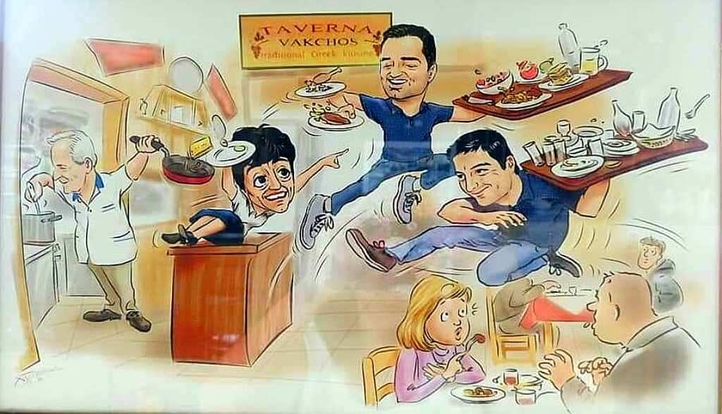 Το εξαιρετικό αυτό σκίτσο αποδίδει με τον πιο αληθινό και αδιάψευστο τρόπο την αέναη κινητικότητα των 4 μελών της οικογένειας Θεοδωράκη, προκειμένου να ικανοποιήσουν στο έπακρο τις επιθυμίες των πελατών τους.