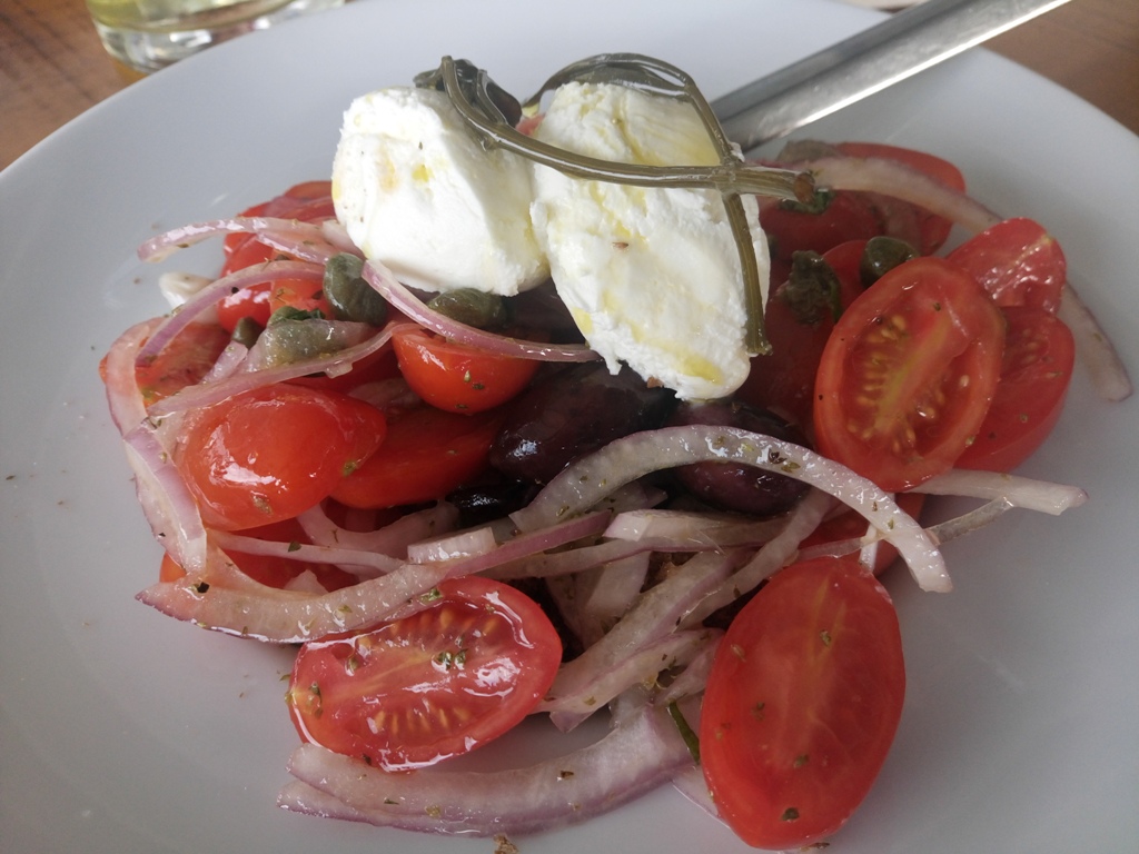 Κυκλαδίτικη σαλάτα με τοματίνια, ξινομυζήθρα Σχοινούσας, τραγανά παξιμαδάκια και κρίταμο τουρσί από την Τήνο.