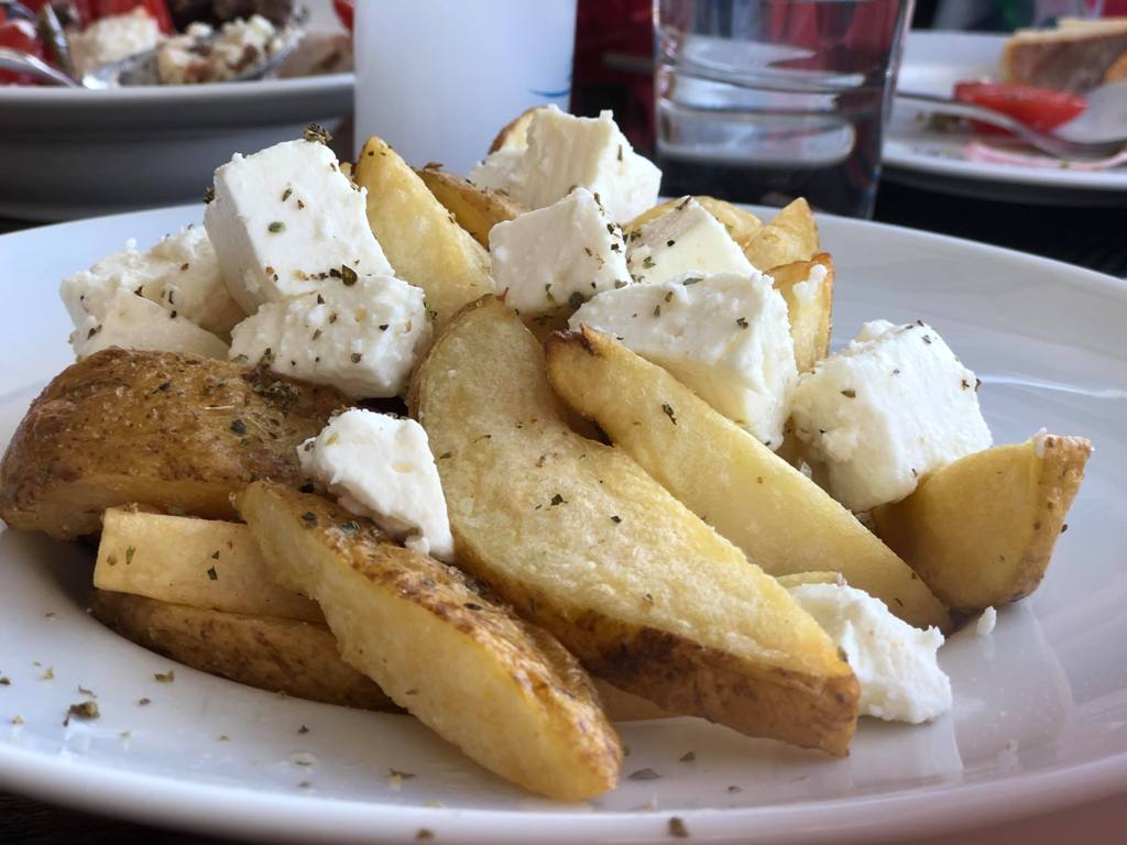 Πατατούλες τηγανιτές Νάξου με τη φλούδα τους και φέτα.