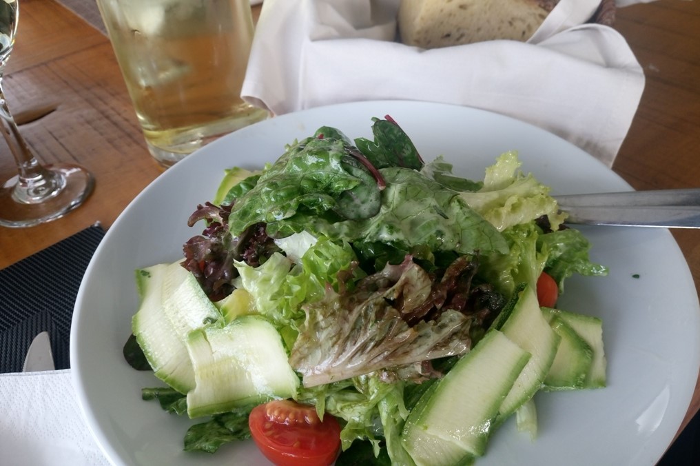 Πράσινη σαλάτα με ανάμεικτα φύλλα σαλάτας, τοματίνια, κολοκύθι, lime και ελαιόλαδο.