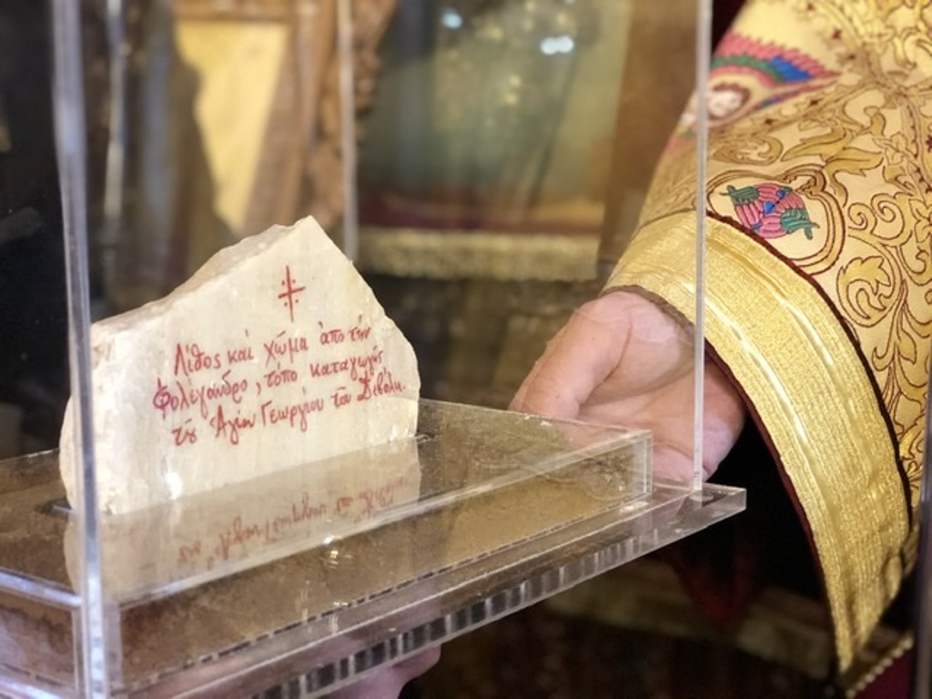 Στο πλαίσιο της εθιμοτυπικής ανταλλαγής δώρων, ο Σεβασμιώτατος Μητροπολίτης Σύρου-Φολεγάνδρου Δωρόθεος Β ‘ προσέφερε στον Σεβασμιώτατο Μητροπολίτη Κυδωνίας και Αποκορώνου Δαμασκηνό μία μαρμαρόπετρα και χώμα από την γη της Άνω Μεριάς Φολεγάνδρου…