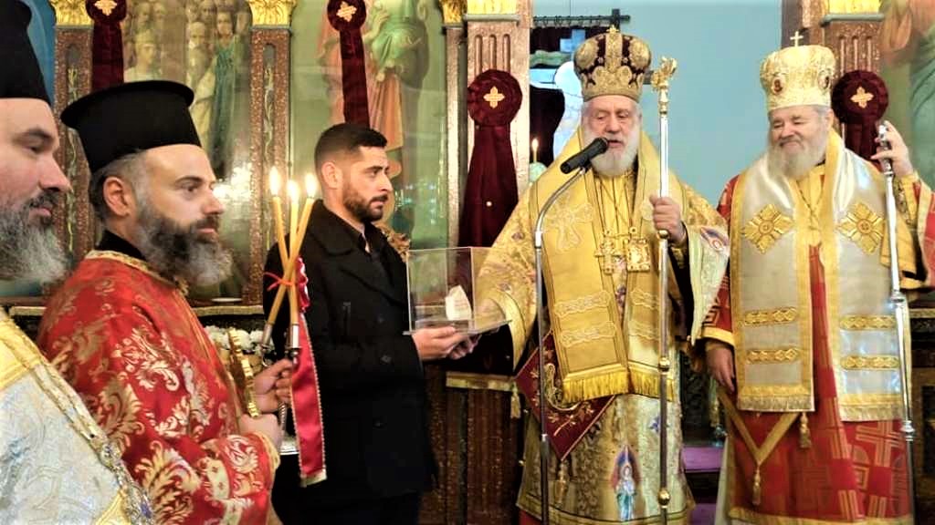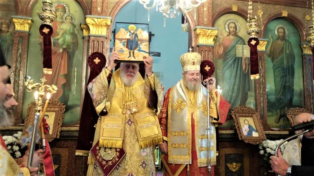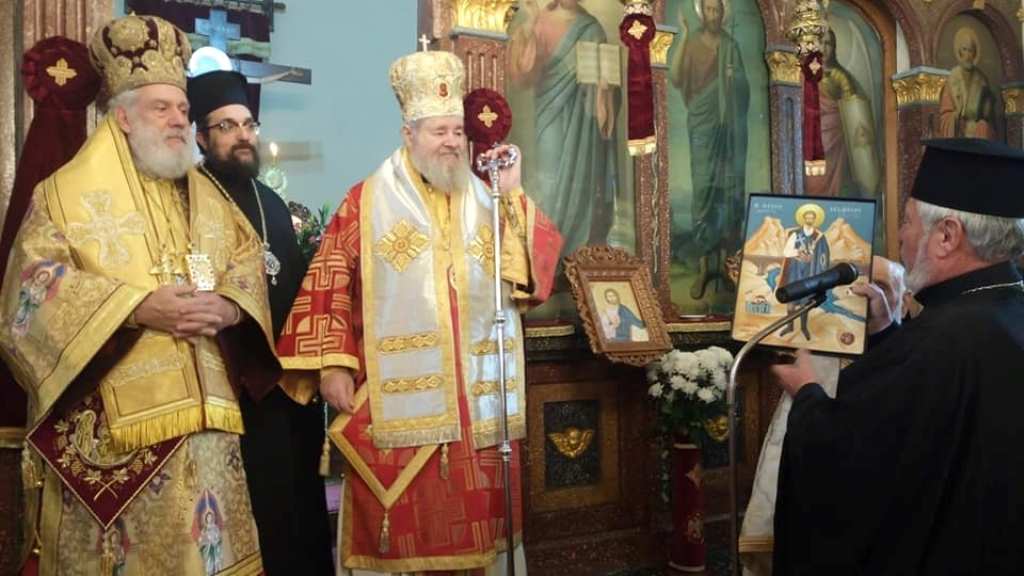 Ο Πρωτοπρεσβύτερος Εμμανουήλ Χατζηδάκης προσφέρει την Εικόνα του Αγίου Γεωργίου Διβόλη, του εκ πατρός Φολεγάνδριου…