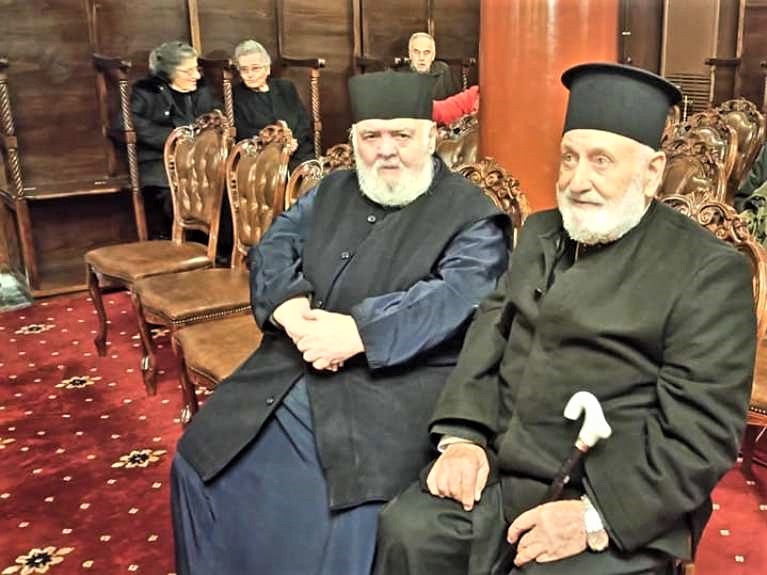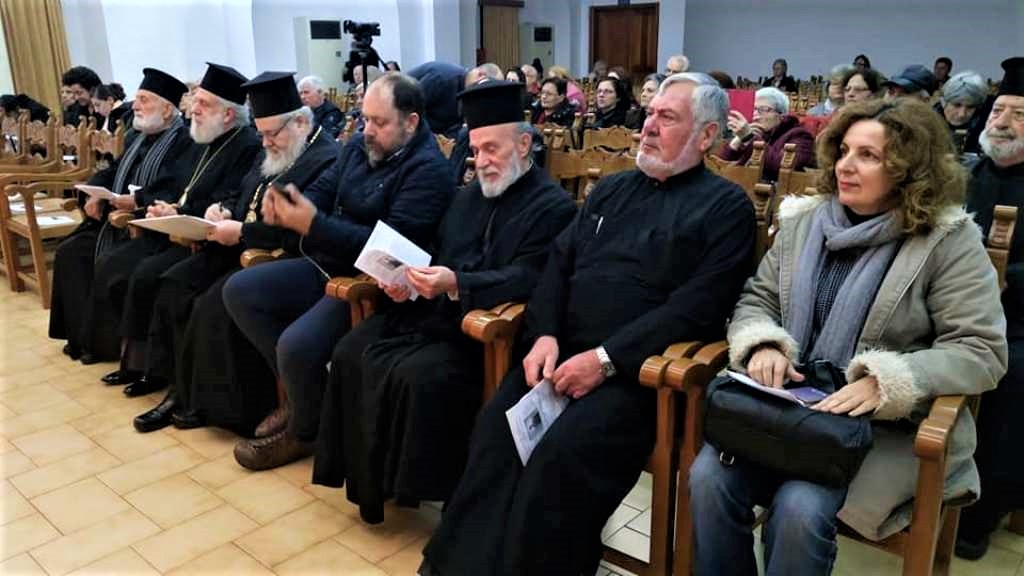 Οι Πρωτοπρεσβύτεροι π. Παναγιώτης Μαρινάκης (δεξιά) και π. Απόστολος Διαμαντούδης, εφημέριος του Ι.Ν. Αγίας Αικατερίνης Νέας Χώρας Χανίων, αναμένουν την έναρξη της ομιλίας του π. Εφραίμ.