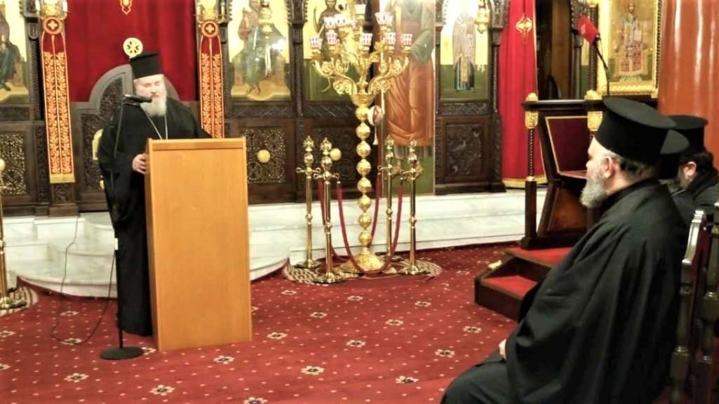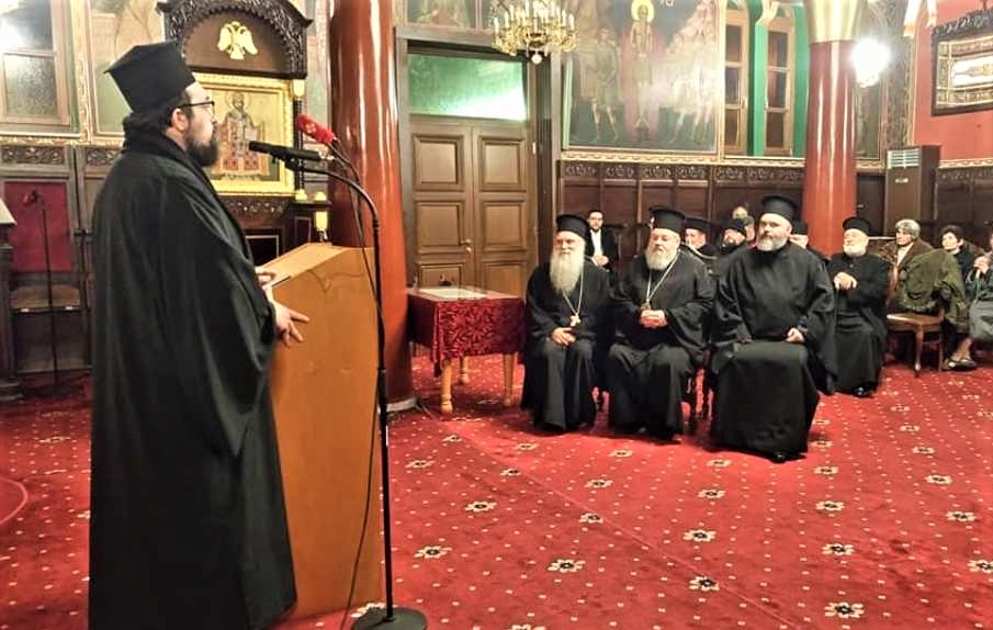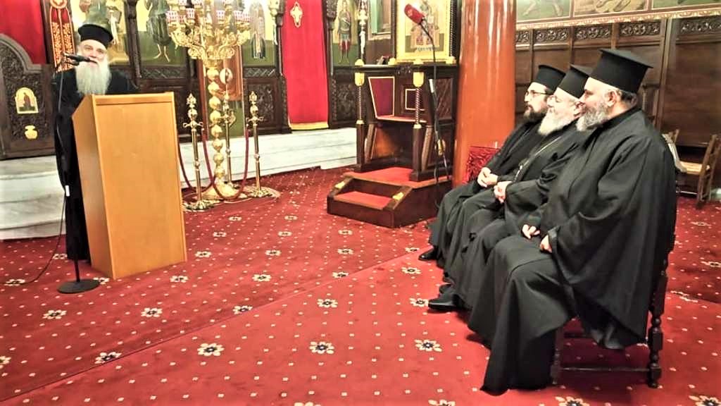 Ο Αρχιμανδρίτης Εφραίμ Τριανταφυλλόπουλος στο βήμα για την εμπνευσμένη ομιλία του, την οποία μετά μεγίστης προσοχής παρακολουθούν (από αριστερά): o Θεοφιλέστατος Επίσκοπος Δορυλαίου Δαμασκηνός, ο Σεβασμιώτατος Μητροπολίτης Κυδωνίας και Αποκορώνου Δαμασκηνός και ο Πανοσιολογιώτατος Αρχιμανδρίτης Διονύσιος Κατερίνας της Ιεράς Αρχιεπισκοπής Αθηνών.