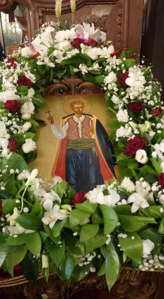 Η καταστόλιστη με άνθη εικόνα του Αγίου Νεομάρτυρος Γεωργίου Διβόλη εξ Αλικιανού Κυδωνίας Κρήτης.