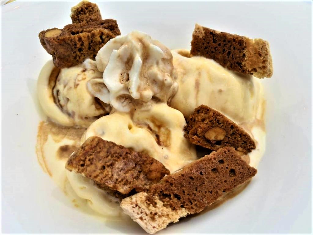 Για το τέλος του απολαυστικού γεύματος ένα εξίσου απολαυστικό επιδόρπιο με ιταλικές και πάλι επιρροές: gelato Sabbioncello με παγωτό βανίλια, ιταλικά cookies Cantuccini και καφέ espresso!