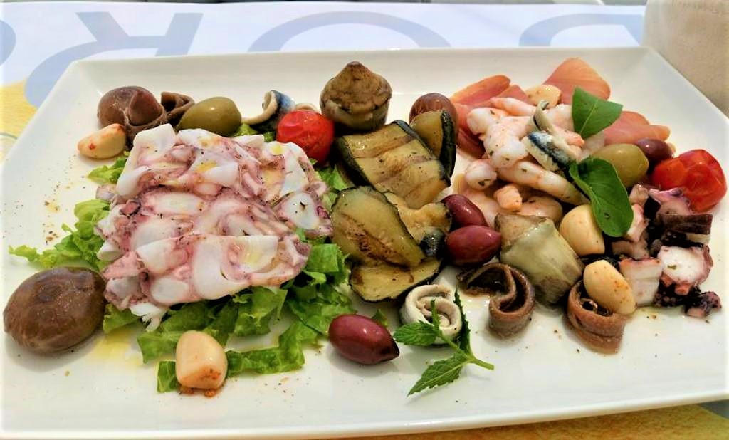 Και πώς να μην πεις κάτι τέτοιο όταν ξεκινάς με ένα πιάτο, στην κατηγορία των ορεκτικών, για δύο άτομα, το οποίο κυριολεκτικά περιλαμβάνει ό,τι κολυμπάει στην θάλασσα και ό,τι φύεται στην γη της Μεσογείου: καπνιστό τόνο, καρπάτσιο χταποδιού, μαριναρισμένες γαρίδες, παστές αντσούγιες, πατέ ψαριού, αλλά και ντοματίνια, ελιές, πράσινη σαλάτα και λαχανικά τουρσί.