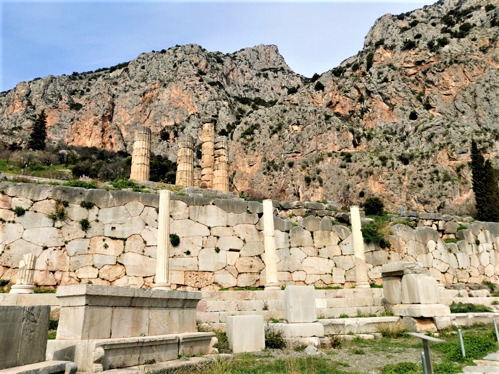 Ο ναός του Απόλλωνα, το σημαντικότερο μνημείο του ιερού του Απόλλωνα στους Δελφούς -οι κίονές του διακρίνονται στο άνω μέρος της φωτογραφίας- βρισκόταν σε περίοπτη και κεντρική θέση μέσα στο τέμενος. Στο ναό στεγάζονταν τα αγάλματα και τα αφιερώματα προς το θεό, αλλά εδώ γίνονταν και οι ιεροτελεστίες, που είχαν σχέση με τη λατρεία, η σπουδαιότερη από τις οποίες ήταν η διαδικασία της μαντείας.