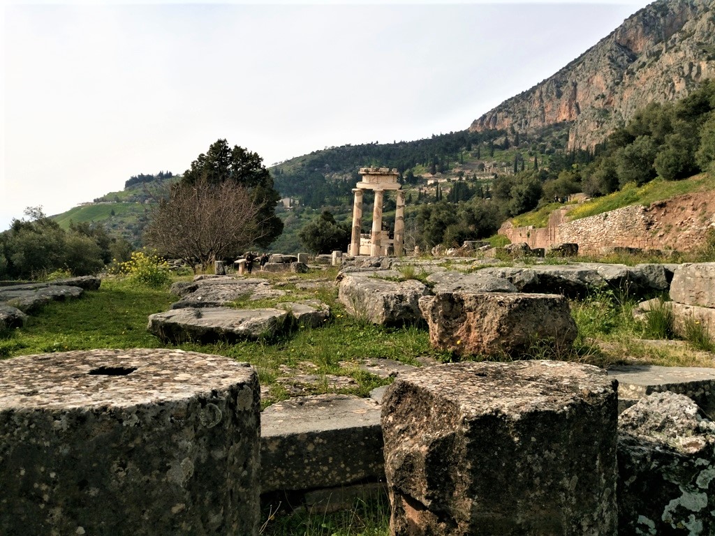 Ερχόμενοι από την Αθήνα συναντούμε πρώτα το ιερό της Αθηνάς Προναίας, όπου σώζεται η περίφημη Θόλος, το κυκλικό κτήριο και ερείπια των τριών ναών της θεάς…