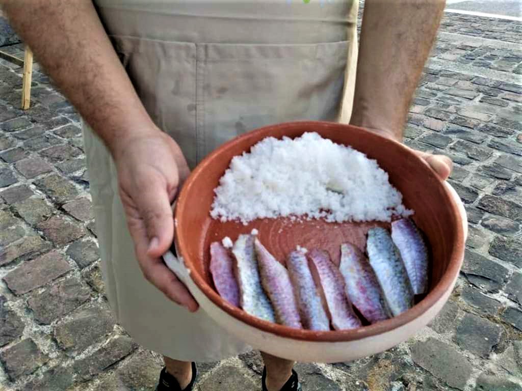 Η καπιράδα, λοιπόν, θα δεχτεί στην αγκαλιά της φιλεταρισμένο μπαρμπουνάκι, το οποίο για 10 λεπτά έχει παραμείνει εντός μείγματος αλατιού και ζάχαρης -σε αναλογία 120γρ. και 80γρ. αντίστοιχα- προκειμένου να «ψηθεί» η σάρκα του, αλλά και να αποκτήσει γευστικό βάθος. Εδώ, ο Αλέξανδρος επιδεικνύει στο κοινό τα στάδια της συνταγής…