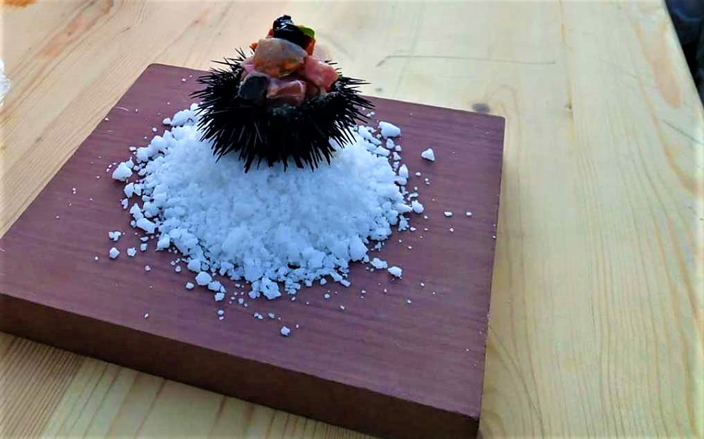 Ο αχινός σερβιρισμένος πάνω σε ένα λοφάκι αλατιού, από τις γειτονικές Αλυκές του Κόλπου της Καλλονής. Γεύση και food styling πραγματικά μας μάγεψαν! Πρέπει να τονίσουμε ότι το τελικό άγγιγμα της εντυπωσιακής αυτής δημιουργίας είναι η μαρμελάδα αρώνια, από ντόπια μαύρα μούρα της Φάρμα Καριοφύλλη. Μπράβο Γιώργο για την γλυκιά δημιουργία και Αλέξανδρε για τον προχωρημένο συνδυασμό!
