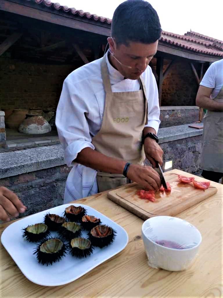 Έχουμε ήδη περάσει στην εκτέλεση της δεύτερης συνταγής, του λεσβιακού ceviche, για το γέμισμα των επίσης ντόπιων αχινών.