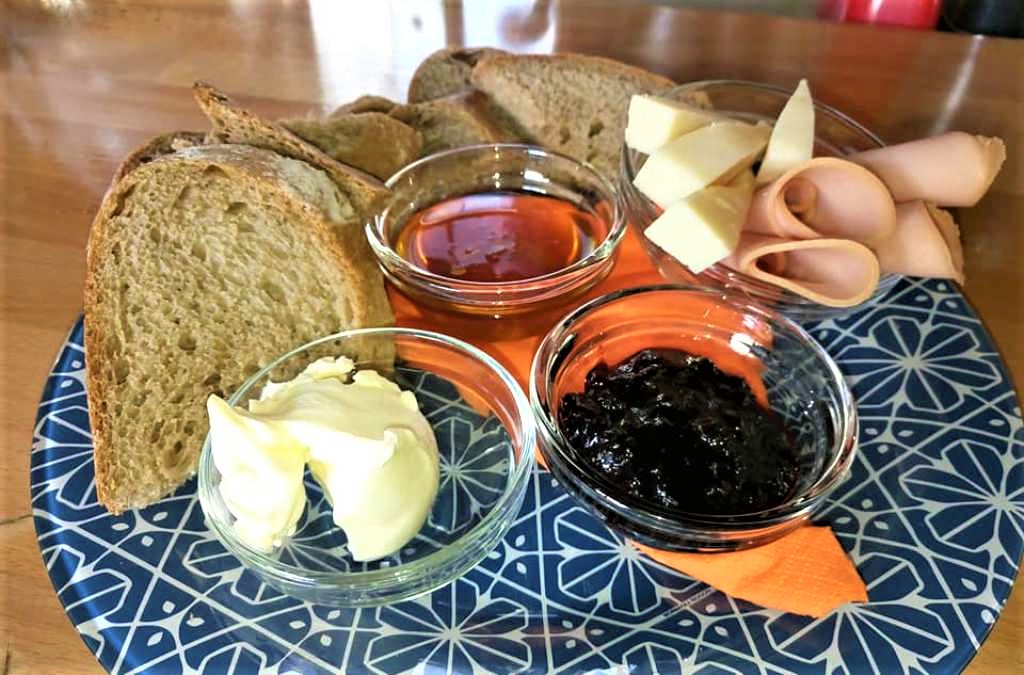 Το Λεσβιακό πρωινό περιλαμβάνει ντόπιο μέλι, γραβιέρα και φυσικά ψωμάκι, αλλά και μαρμελάδα από, επίσης, ντόπια μαύρα μούρα αρώνια, τα «βατόμουρα της νιότης». Δείτε το σχετικό video στο κανάλι μας στο YouTube.