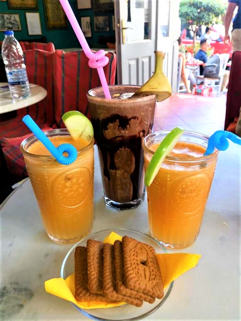 Φρέσκοι δυναμωτικοί χυμοί με καρότο, πορτοκάλι, μήλο και ginger (απλά τέλειοι!) και στο κέντρο ρόφημα σοκολάτας με μπανάνα.