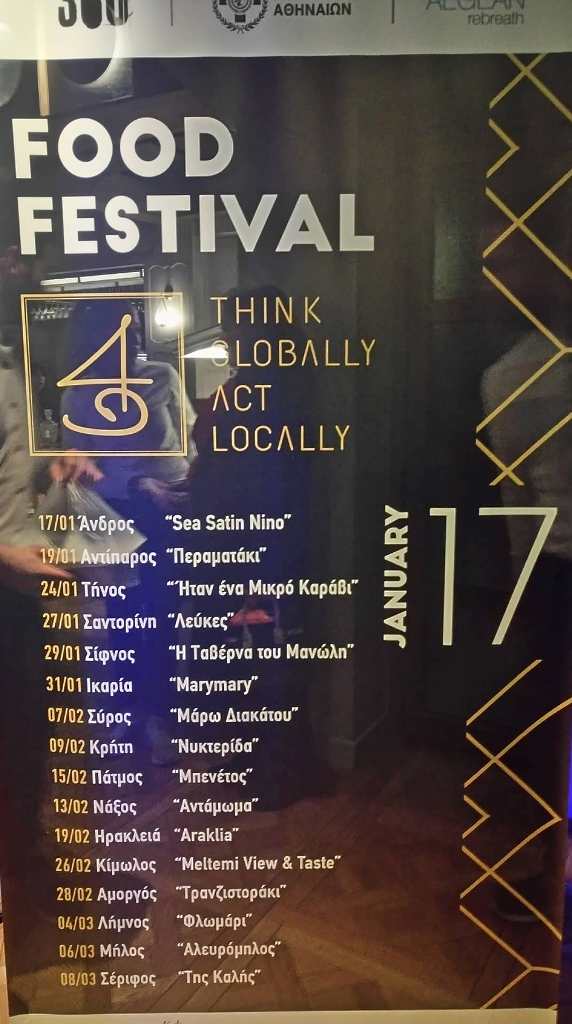 Το γνωστό Cocktailbar Restaurant «360°» με την εκπληκτική θέα του, υλοποιεί αυτήν την περίοδο μία πολύ σπουδαία πρωτοβουλία, η οποία φέρει την επωνυμία «Think Globally, Act Locally», έχει τεθεί υπό την αιγίδα του Δήμου Αθηναίων και στο πλαίσιό της 16 εστιατόρια από διάφορα νησιά της Ελλάδος, βρίσκονται στους χώρους του 360° από τις 17 Ιανουαρίου έως και τις 8 Μαρτίου 2020, προκειμένου να μαγειρέψουν τοπικές συνταγές του τόπου τους βασισμένες σε ντόπια προϊόντα, πραγματοποιώντας παράλληλα θεματικές βραδιές. Τα έσοδα της φετινής διοργάνωσης του Φεστιβάλ θα διατεθούν στην οργάνωση Aegean Rebreath, που υλοποιεί δράσεις για την προστασία του θαλάσσιου περιβάλλοντος, ενώ απώτερος στόχος των διοργανωτών παραμένει η θεσμοθέτηση του Φεστιβάλ και η διεξαγωγή του σε ετήσια βάση, έτσι ώστε να δοθεί η δυνατότητα στήριξης και άλλων περιβαλλοντικών δράσεων ανά την Ελλάδα. Έτσι, οι συμμετέχοντες στα γαστρονομικά αυτά events θα έχουν αφενός μεν την δυνατότητα να ταξιδέψουν στις γεύσεις και τα προϊόντα νησιωτικών και άλλων περιοχών της Ελλάδος απολαμβάνοντας αιγαιοπελαγίτικες γεύσεις, αφετέρου δε θα μπορέσουν να σταθούν και οι ίδιοι αρωγοί εθελοντικών ομάδων, που δραστηριοποιούνται στον τομέα της προστασίας του περιβάλλοντος και του καθαρισμού των θαλασσών και των ακτών μας. Τόσο κατά τη διάρκεια του Φεστιβάλ, όσο και μετά την ολοκλήρωσή του, ο πολυχώρος 360° θα λειτουργεί χωρίς πλαστικά μιας χρήσης, μεταδίδοντας ένα σαφές μήνυμα για το σημαντικό ρόλο των εστιατορίων και των bars, στην προσπάθεια αποφόρτισης του περιβάλλοντος από απορρίμματα.