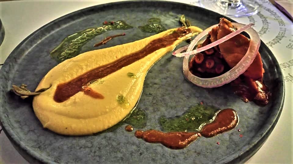 Το δεύτερο ορεκτικό ήταν βελούδινος άφκος με χταπόδι μαγειρεμένο στη γάστρα, μεθυσμένο σε μοσχάτο κρασί Λήμνου. Ο άφκος, η φάβα της Λήμνου, κερδίζει συνεχώς έδαφος στον ανταγωνισμό με συγκριτικά πλεονεκτήματα την βραστικότητα και την πλούσια γεύση του.