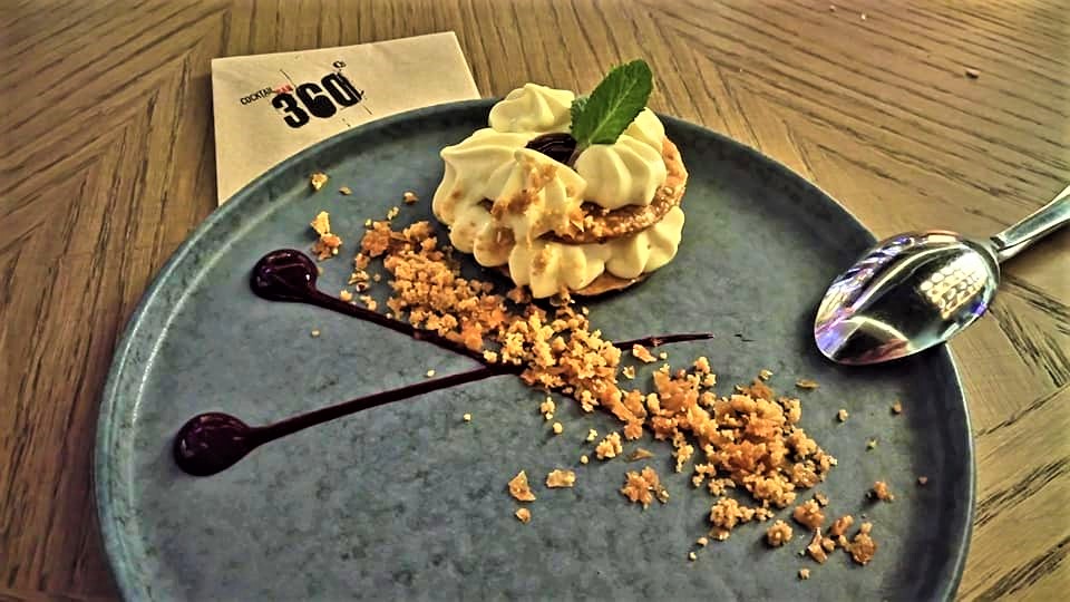 Σαμσάς mille-feuille με κρέμα τυριού, κρέμα ζαχαροπλαστικής και σάλτσα κόκκινων φρούτων, σε μια εξαιρετική ως προς την σύλληψη και την εκτέλεσή της πρόταση. Οι σαμσάδες είναι ένα από τα πλέον χαρακτηριστικά χριστουγεννιάτικα γλυκίσματα της Λήμνου, κάτι ανάμεσα σε σαραγλί και μπακλαβά, αλλά συγχρόνως και εντελώς διαφορετικό και μοναδικό. Η παραδοσιακή συνταγή τους περιλαμβάνει, μεταξύ άλλων, φύλλο κρούστας, σουσάμι, καρυδόψιχα, αμυγδαλόψιχα, ζάχαρη, κανέλα, σκόνη γαρύφαλλο και φυσικά μέλι για το σιρόπιασμά τους.