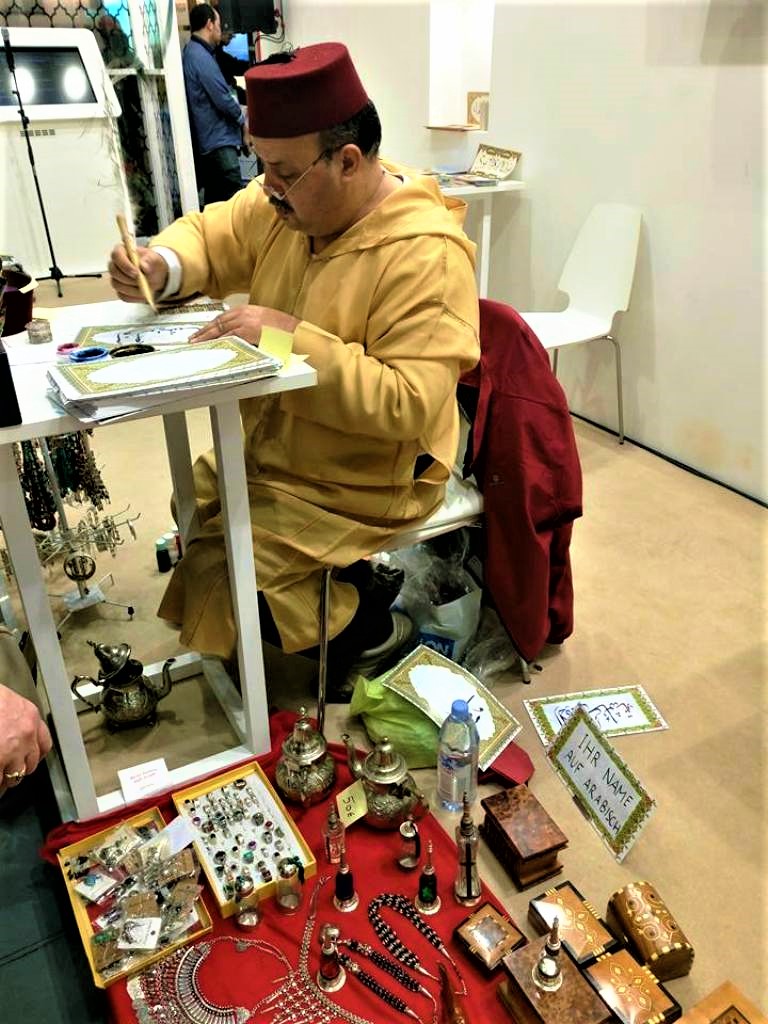 Μαροκινός καλλιτέχνης γράφει το όνομα κάθε επισκέπτη με αραβική καλλιγραφική γραφή.