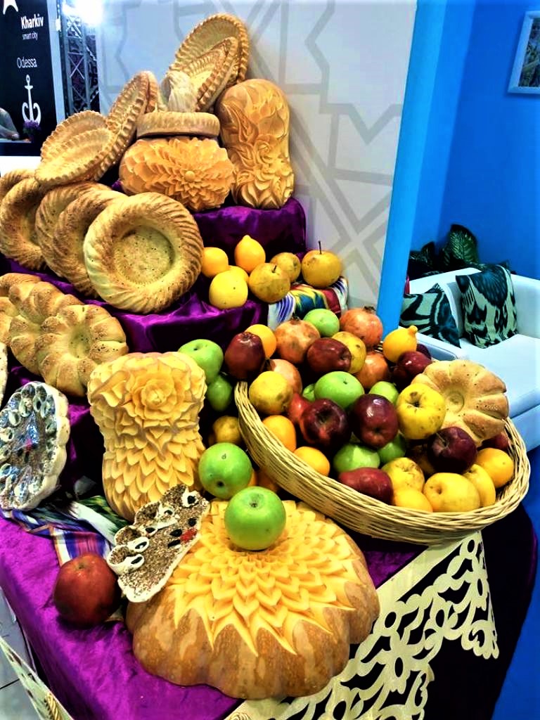 Εντυπωσιακή σύνθεση στο περίπτερο του Ουζμπεκιστάν με φρούτα, γλυκίσματα, σκαλιστές κολοκύθες και παραδοσιακά ψωμιά patyr. Το ψωμί (lepyoshka) είναι ιερό για τους Ουζμπέκους, γι’ αυτό όταν κάποιος φύγει από το σπίτι δαγκώνει και παίρνει μαζί του μια μικρή μπουκιά, την οποία τρώει κατά την επιστροφή του. Υπάρχουν δύο είδη ψωμιού, το γιορτινό patyr της φωτογραφίας και το απλό επίπεδου σχήματος (obi-non).