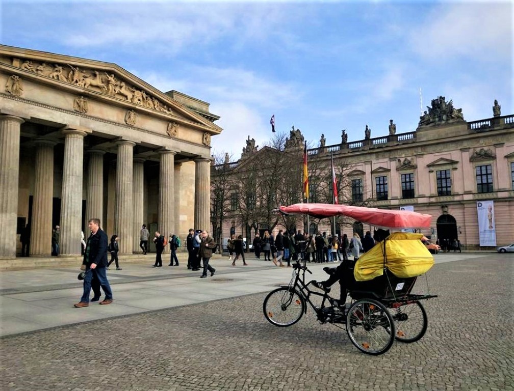 …και εδώ θα συναντήσετε τα πιο πρωτότυπα μεταφορικά μέσα, όπως άμαξες ή αυτά τα μικροσκοπικά ταξί, που το χειμώνα προσφέρουν και κουβέρτα στους επιβάτες τους, ως ασπίδα κατά του τσουχτερού κρύου! Το κτήριο με το αέτωμα είναι το Μνημείο του Άγνωστου Στρατιώτη (Neue Wache), το οποίο χρησιμεύει ως «Κεντρικό Μνημείο της Ομοσπονδιακής Δημοκρατίας της Γερμανίας για τα θύματα του πολέμου και της δικτατορίας». Χρονολογείται από το 1816 -αρχικά χρησιμοποιήθηκε ως φυλακή- σχεδιάστηκε από τους αρχιτέκτονες Karl Friedrich Schinkel και Salomo Sachs και αποτελεί πρωτοποριακό παράδειγμα γερμανο-ελληνικής αναγεννησιακής αρχιτεκτονικής.
