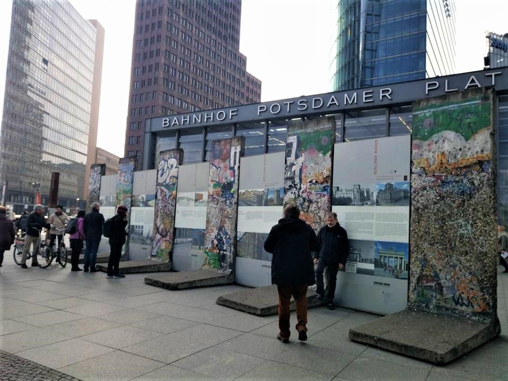 Εναπομείναντα τμήματα του Τείχους του Βερολίνου εκτίθενται στην Potsdamer Platz.