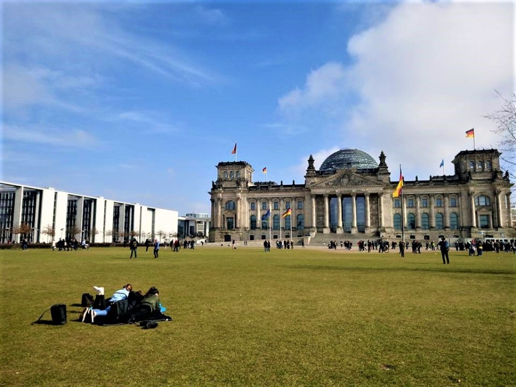 Απολαμβάνοντας την σπάνια -για την χειμερινή περίοδο- ηλιόλουστη μέρα, με θέα τα κτήρια του Ομοσπονδιακού Κοινοβουλίου και της Καγκελαρίας (αριστερά).