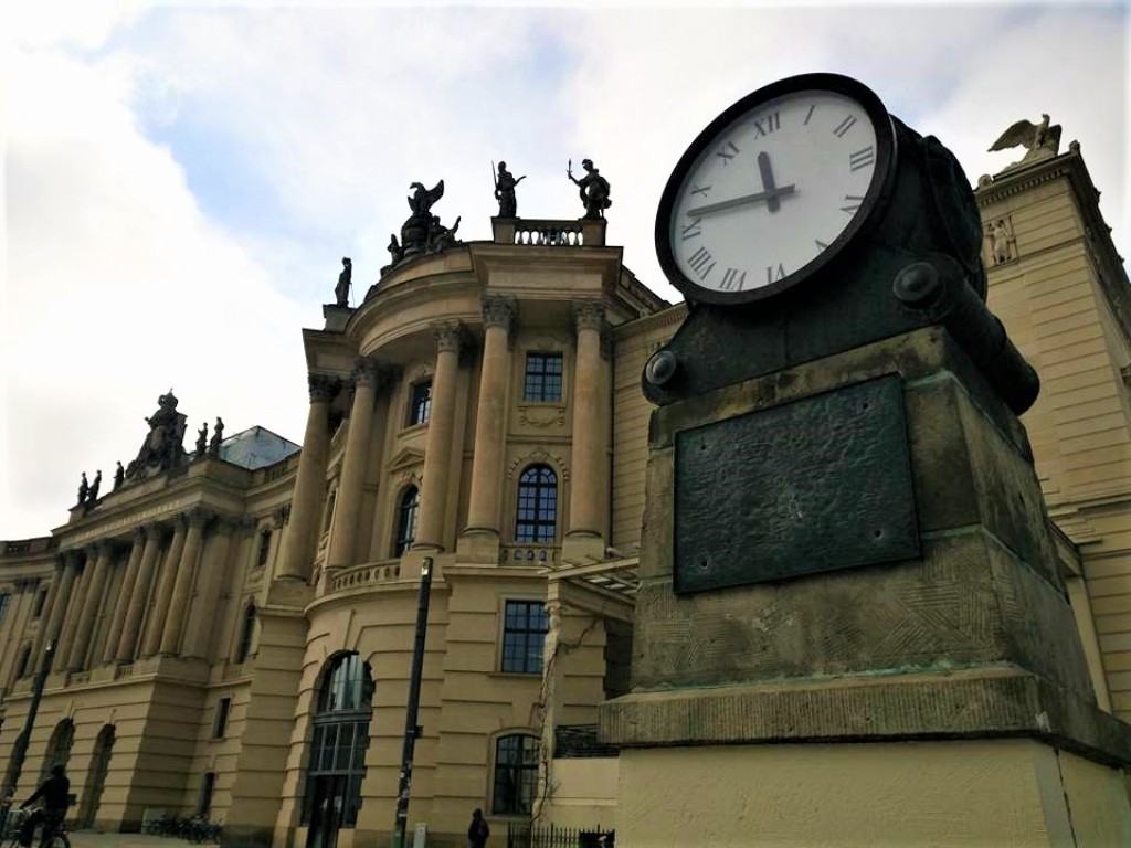 …-έμπροσθέν του ο έφιππος ανδριάντας του Φρειδερίκου του Μεγάλου (Φρειδερίκος της Πρωσίας)- το παλαιότερο Πανεπιστήμιο του Βερολίνου, που ιδρύθηκε το 1810 -με το όνομα αρχικά Πανεπιστήμιο του Βερολίνου- από τον Πρώσσο γλωσσολόγο Βίλχελμ φον Χούμπολτ.