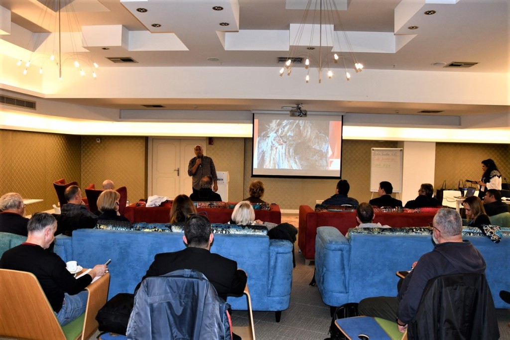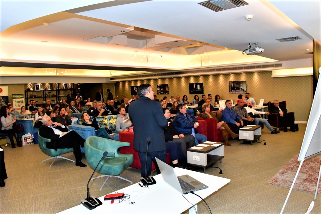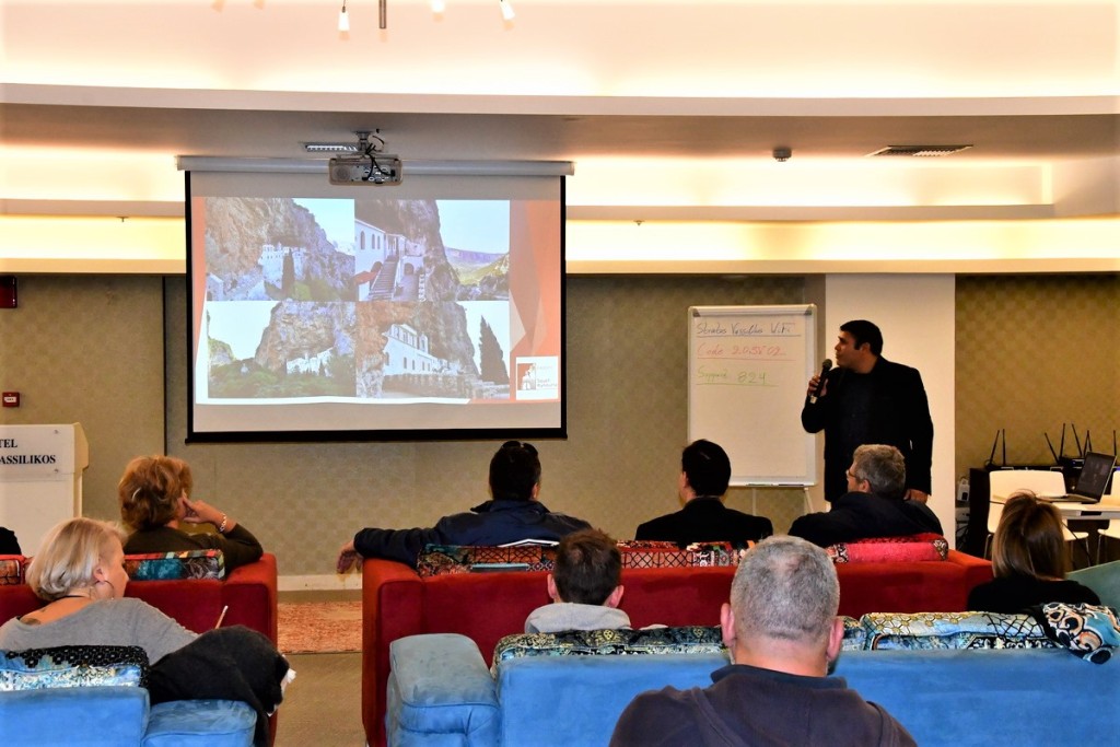 Ο Ανέστης Βασιλειάδης, Πρόεδρος της Ένωσης Ξενοδόχων και Ιδιοκτητών Τουριστικών Καταλυμάτων Νότιας Κυνουρίας, παρουσιάζει το τουριστικό προϊόν της περιοχής στους συμμετέχοντες στην εκδήλωση.