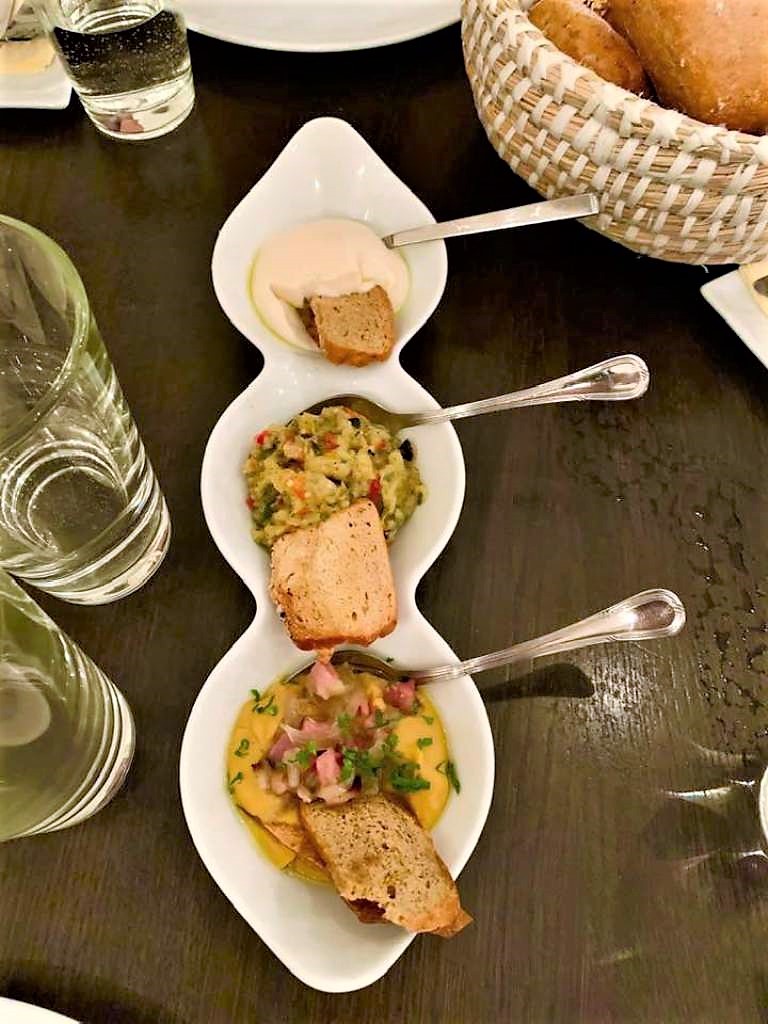 Τριλογία ορεκτικών στο «μανιάτικο καλωσόρισμα»: αέρινη ταραμοσαλάτα από λευκό ταραμά που πρωταγωνιστέι με την γεύση του, μελιτζανοσαλάτα και φάβα με σύγκλινο Μάνης και καραμελωμένο κρεμμυδάκι.