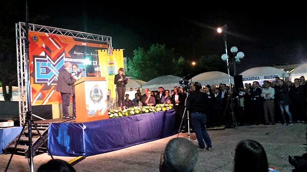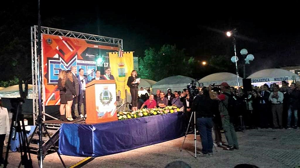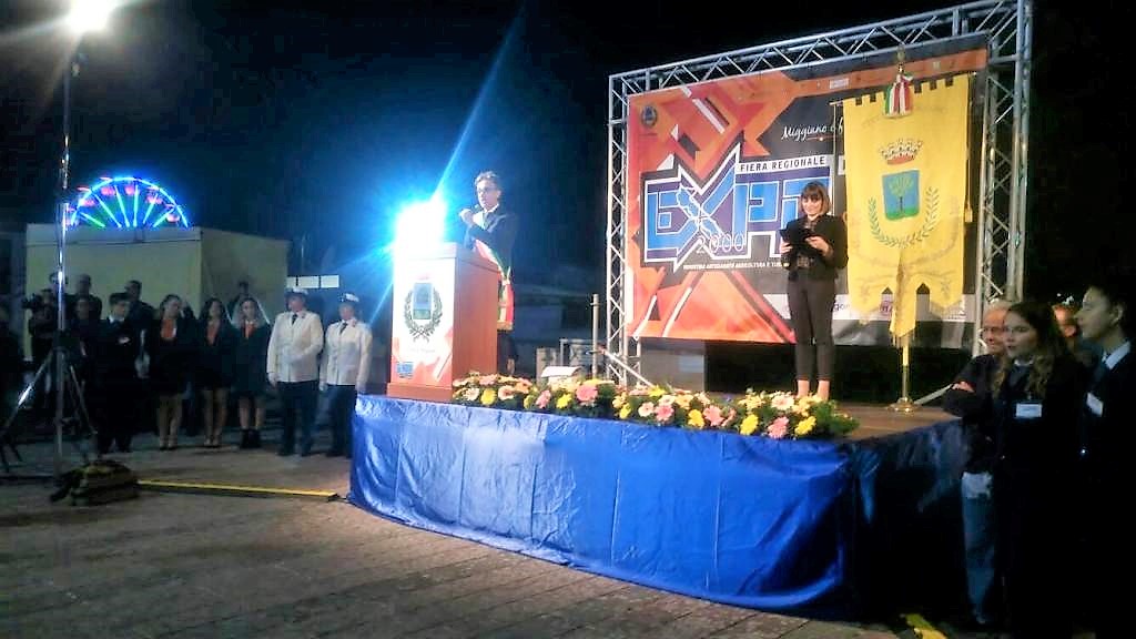 Στο βήμα ο δραστήριος Δήμαρχος του Miggiano Michele Sperti, απευθύνει χαιρετισμό στους εκατοντάδες παρακολουθούντες την τελετή εγκαινίων της «EXRO 2000» Miggianο 2019.