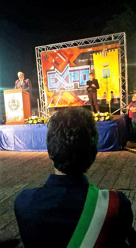 Συνολική άποψη του κατάμεστου από κόσμο χώρου της εκδήλωσης, παρά την απειλή της βροχής. Ο Δήμαρχος Michele Sperti ανακοινώνει πολύ σημαντικές δράσεις στο πλαίσιο της EXPO Miggiano, μεταξύ των οποίων και η συνάντηση του Don Antonio Coluccia, ιδρυτή και Προέδρου της Όπερας Don Giustino Onlus στη Ρώμη, με εκπροσώπους μαθητών της περιοχής.