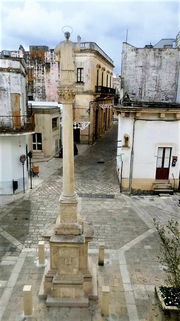 Miggiano, η κεντρική πλατεία της πόλης με χαρακτηριστικά γνωρίσματά της την στήλη και το ρολόι, στην κορυφή του κτηρίου.