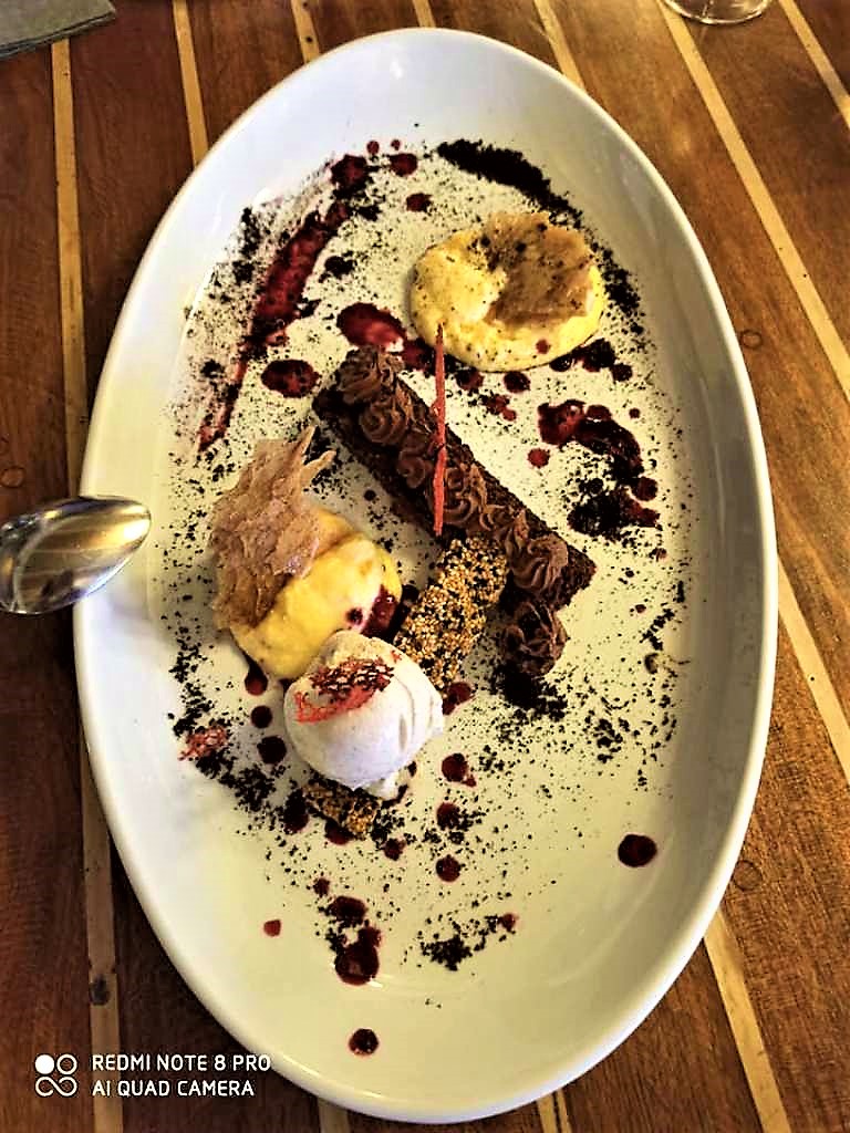 Η γλυκιά τετραλογία που μας αποτελείωσε γευστικά! «Αποδομημένο» γαλακτομπούρεκο με χειροποίητο παγωτό κανέλα, υπέροχη σοκολατένια namelaka με σοκολάτα valrhona και υφή πλούσιας μους. Άλλωστε στα ιαπωνικά αυτό ακριβώς σημαίνει το περίεργο όνομά της, «κρεμώδης κρέμα»! Η πιατέλα ολοκληρώνεται με φεγεντίν σοκολάτας και χειροποίητο παστέλι, πάνω σε χώμα σοκολάτας. Πόσο πιο τέλεια να ολοκληρωθεί ένα καθόλα υπέροχο δείπνο!
