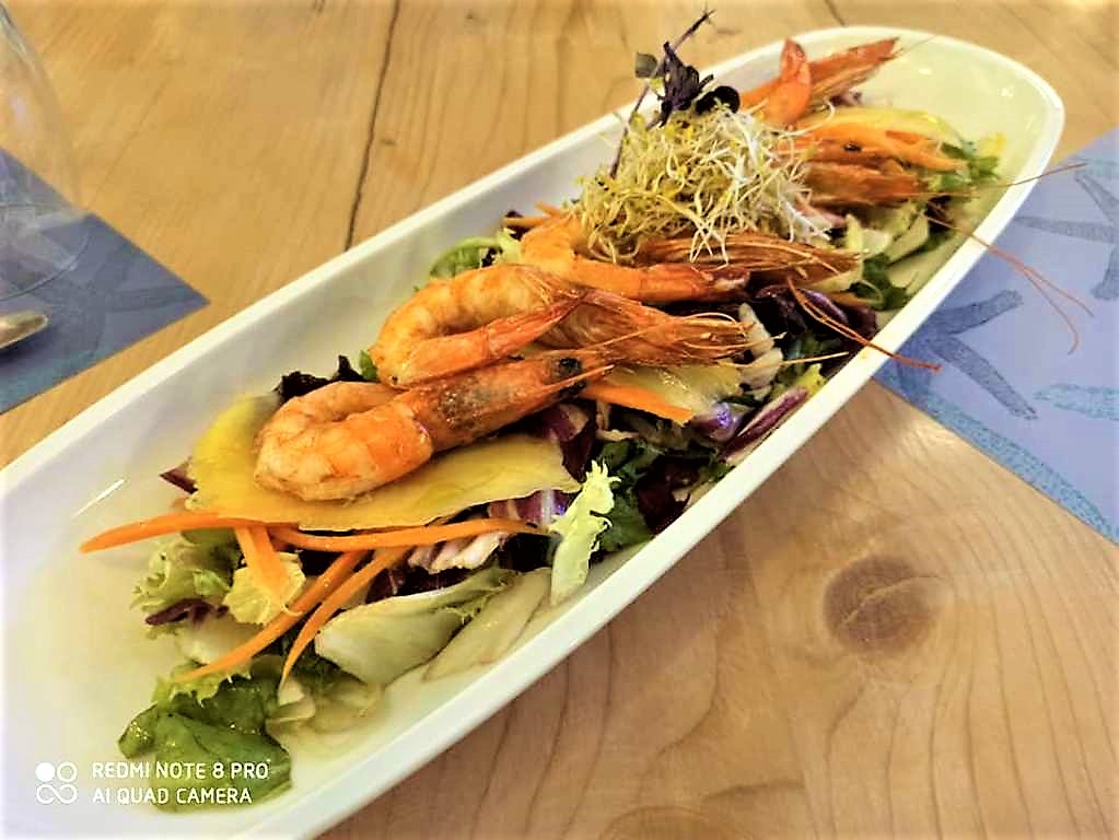 Χορταστική και ολόδροση σαλάτα «Αστερίας» με πανδαισία πράσινων λαχανικών, γαρίδες, μάνγκο, καρότο, αγγούρι και vinegraitte από εσπεριδοειδή και τζίντζερ. Η ποσότητα και η ποικιλά των υλικών της θα την καθιστούσαν άνετα ένα πλήρες κύριο πιάτο.