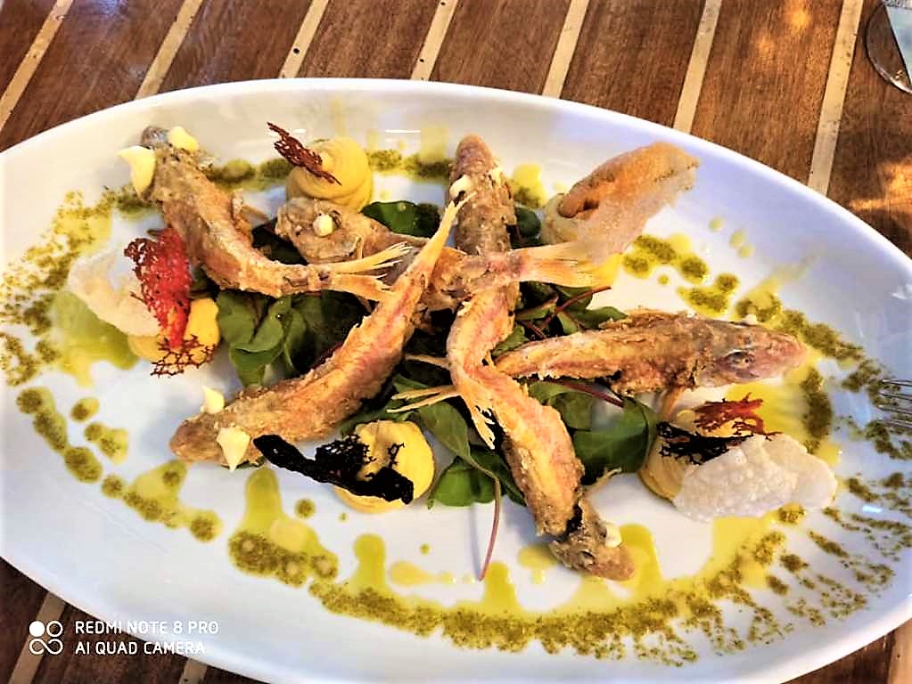 Μπαρμπουνάκια που μοσχοβολούν θάλασσα, φρεσκοτηγανισμένα και κρατσανιστά, πάνω σε λοφάκια από φάβα. Τα ματάκια τους από μείγμα μαγιονέζας και αγιολί, θαυμάζουν κι αυτά -όπως και τα δικά μας- τα εντυπωσιακά πολύχρωμα touile, τα λεπτά διακοσμητικά «μπισκοτάκια», χρωματισμένα με ντομάτα -το κόκκινο- και με μελάνι το μαύρο. Όσο για το λευκό δεν είναι παρά puff ρυζιού, παρασκευασμένο με μια πολύπλοκη ιαπωνική τεχνική, που περιλαμβάνει μεταξύ άλλων βράσιμο, στέγνωμα και τηγάνισμα του ρυζιού και την οποία ο chef Στέλιος Αλεξανδρόπουλος προφανώς γνωρίζει πολύ καλά έχοντας θητεύσει στο Τόκιο.