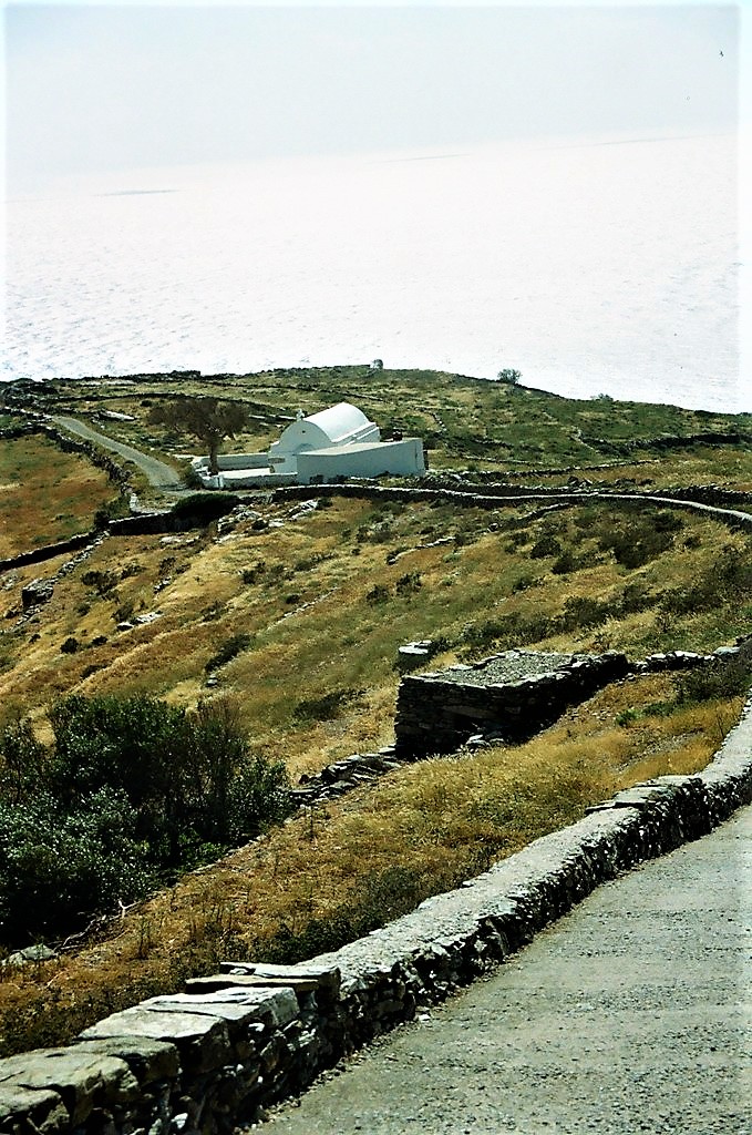 Στο βάθος, στην κορυφή του απέναντι λόφου, διακρίνεται το εκκλησάκι των Αγίων Αναργύρων. Αιώνιοι συνοδοιπόροι στον χώρο και τον χρόνο του νησιού οι δύο Άγιοι χαιρετιούνται καθημερινά, έστω και από μακριά. Σε πρώτο πλάνο, κάτω από την σκιά του ευκαλύπτου, η μαρμάρινη εντοιχισμένη πλάκα, στην οποία αναφερθήκαμε.