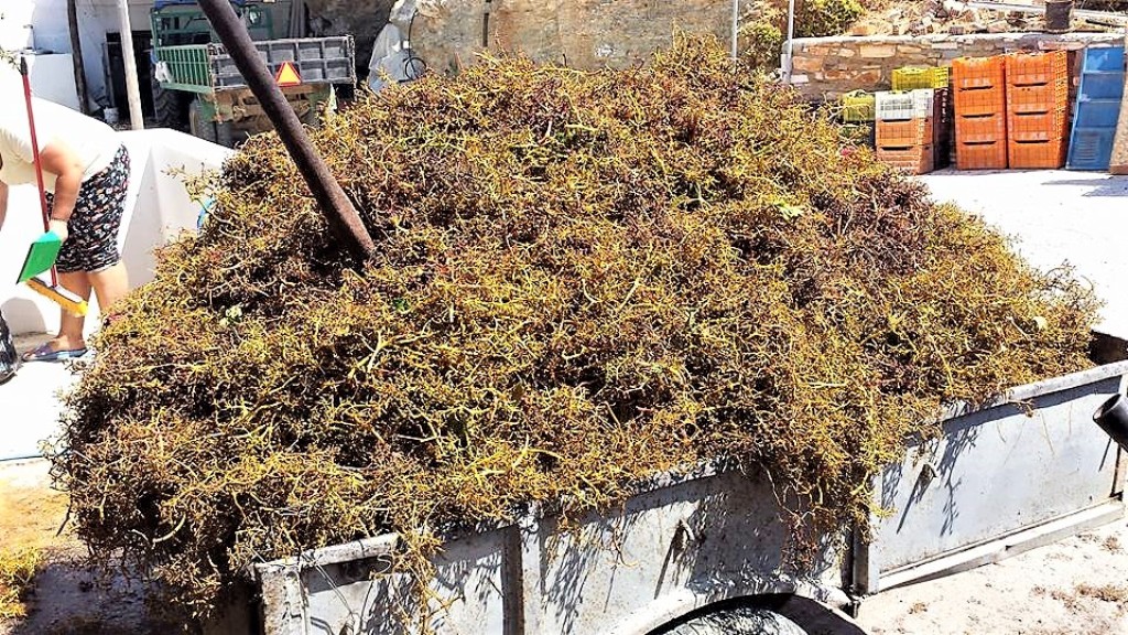 Εδώ τα στρόφιλα, τα κατάλοιπα δηλαδή των σταφυλιών μετά την εξαγωγή του μούστου. Με βάση αυτό το προϊόν θα παραχθεί τον Οκτώβριο η περίφημη παριανή σούμα, το τοπικό τσίπουρο.